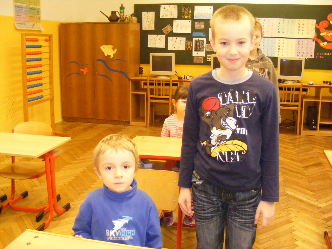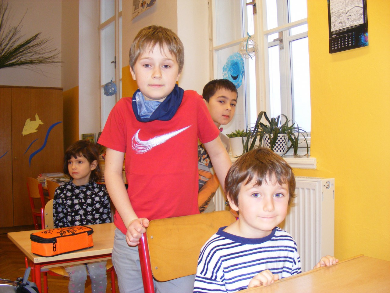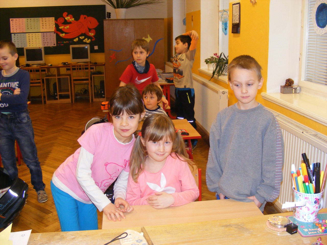V pondělí 25. ledna 2016, asi týden před zápisem do ZŠ, si 11 předškoláků - našich ,,motýlků" vyzkoušelo být na jednu vyučovací hodinu prvňáčkem. Nejdříve se přivítali s paní učitelkou Možíšovou a společně se staršími kamarády si protáhli tělo při ,,pozdravu slunci". Pak sledovali obrázky na tabuli, o kterých jim prvňáčci četli krátké věty. Nejvíce se těšili, že si vyzkouší, jak se sedí ve školní lavici. To se jim splnilo a společně školák + předškolák se pustili do dalšího úkolu. Tentokrát sestavit rozstříhané písmenko nebo číslici. Všichni uspěli a tak se mohli s chutí pustit do spojovačky s omalovánkou šaška. Od paní učitelky Možíšové dostali první školní jedničku, kterou si hrdě odnášeli do školky - pochlubit se a vyprávět zážitky svým mladším kamarádům ,,beruškám".