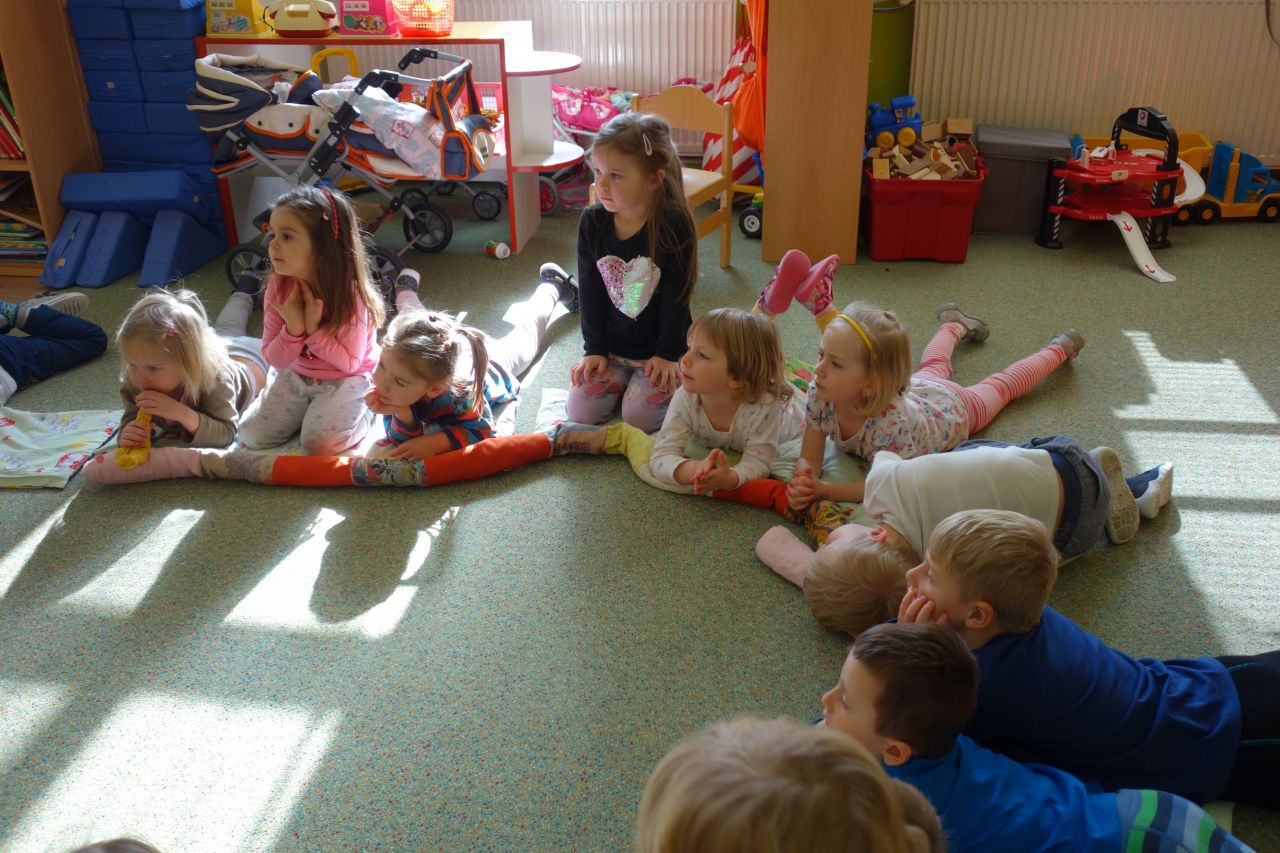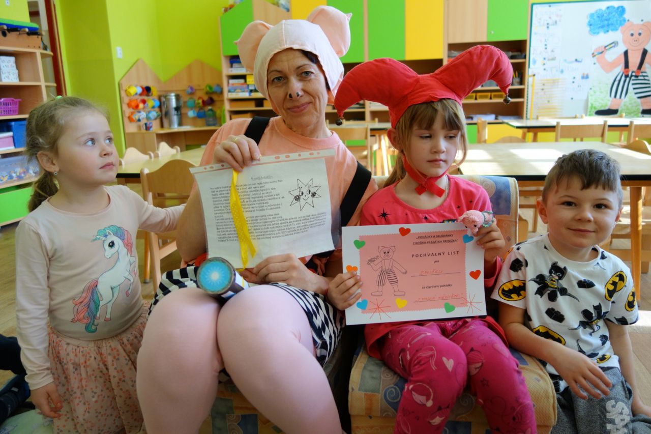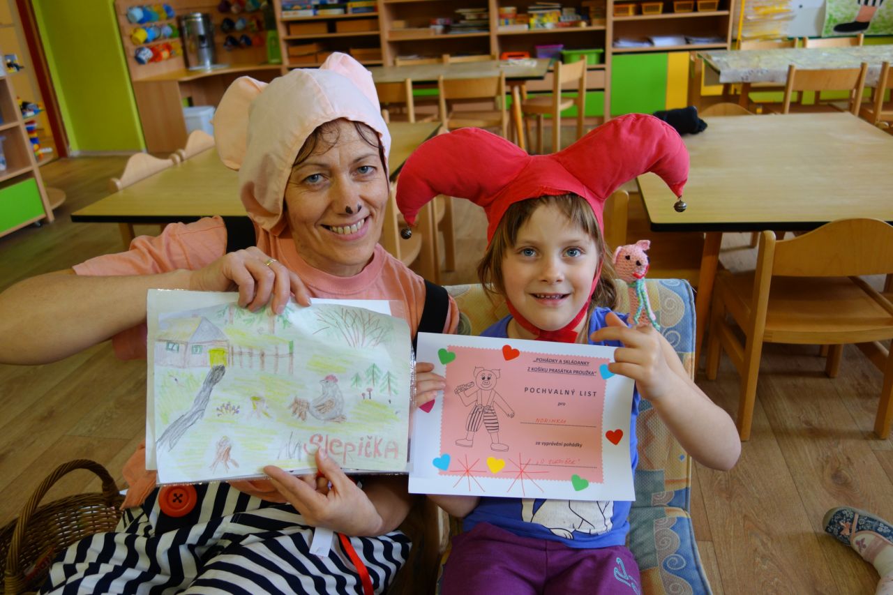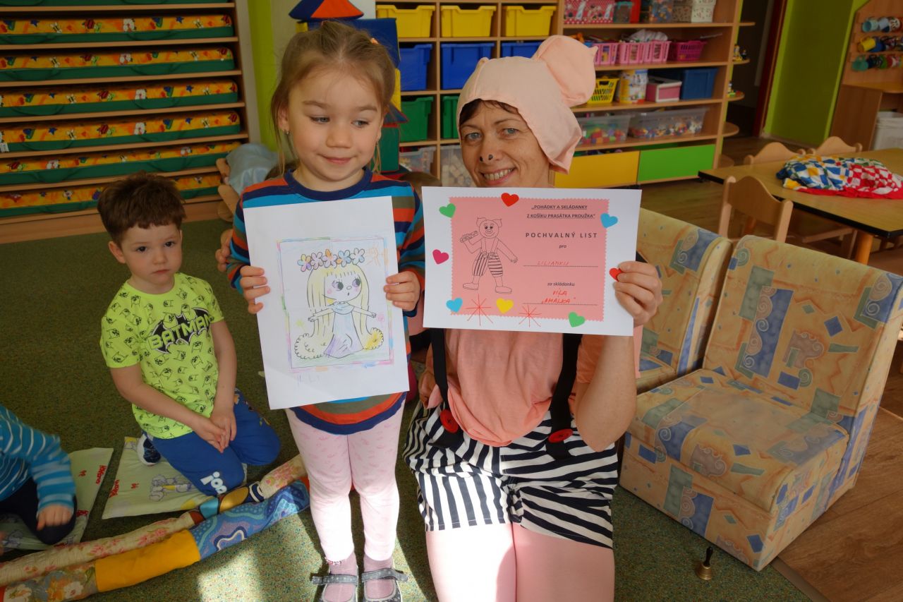 V měsíci březnu k nám proto do školky chodil Proužek častěji než jindy. Nosil nám neznámé pohádky a skládanky v barevných obálkách. Společně jsme se rozpočítali a jeden ,,motýlek" dostal pohádku a ,,včelka" s ,,beruškou" skládanku z pohádky s básničkou. Moc jsme se vždy těšili na příští Proužkovu návštěvu, kdy se ,,motýlek" stal kašpárkem a vyprávěl nám pohádku, kterou se doma s rodiči naučil a snažil se k ní nakreslit i obrázek. Všichni svůj úkol zvládli a byli zaslouženě odměněni. Od Proužka pochvalným listem a prstovým maňáskem prasátka a od kamarádů potleskem. Velké poděkování a pochvala patří všem rodičům za spolupráci. Děti se nestyděly ani nebály ostatním kamarádům ukázat, jak zadaný úkol doma splnily. Naopak se už nemohly dočkat, až je rozpočítadlo vybere.