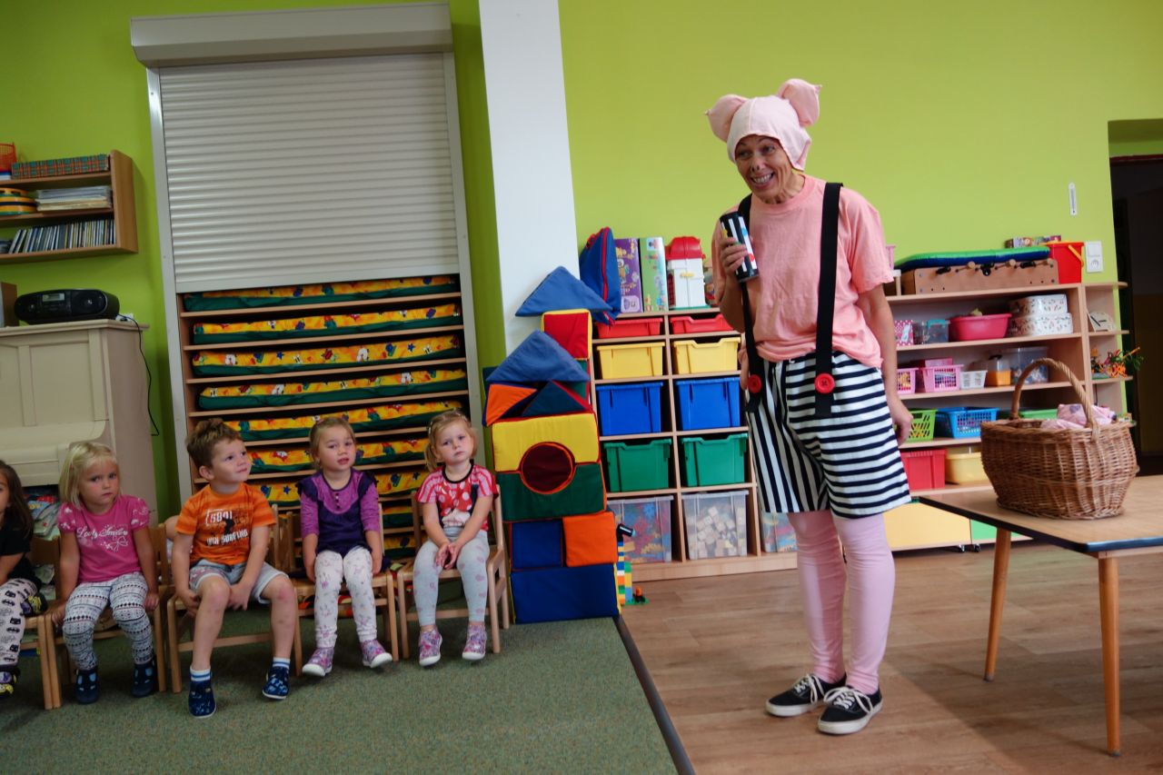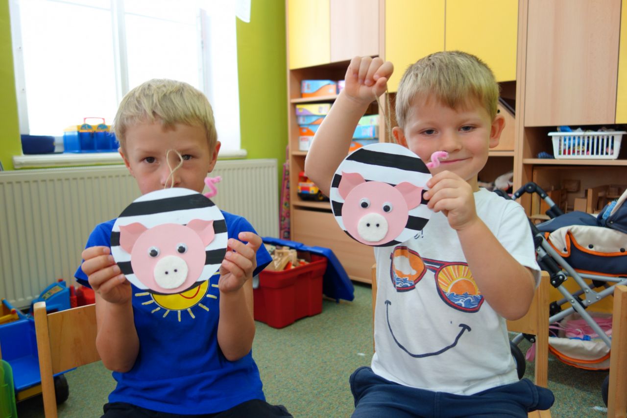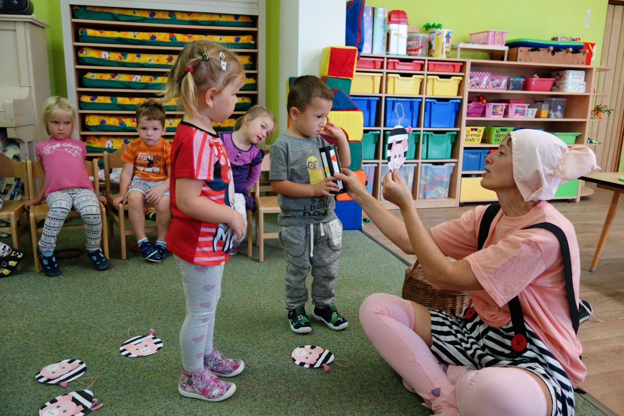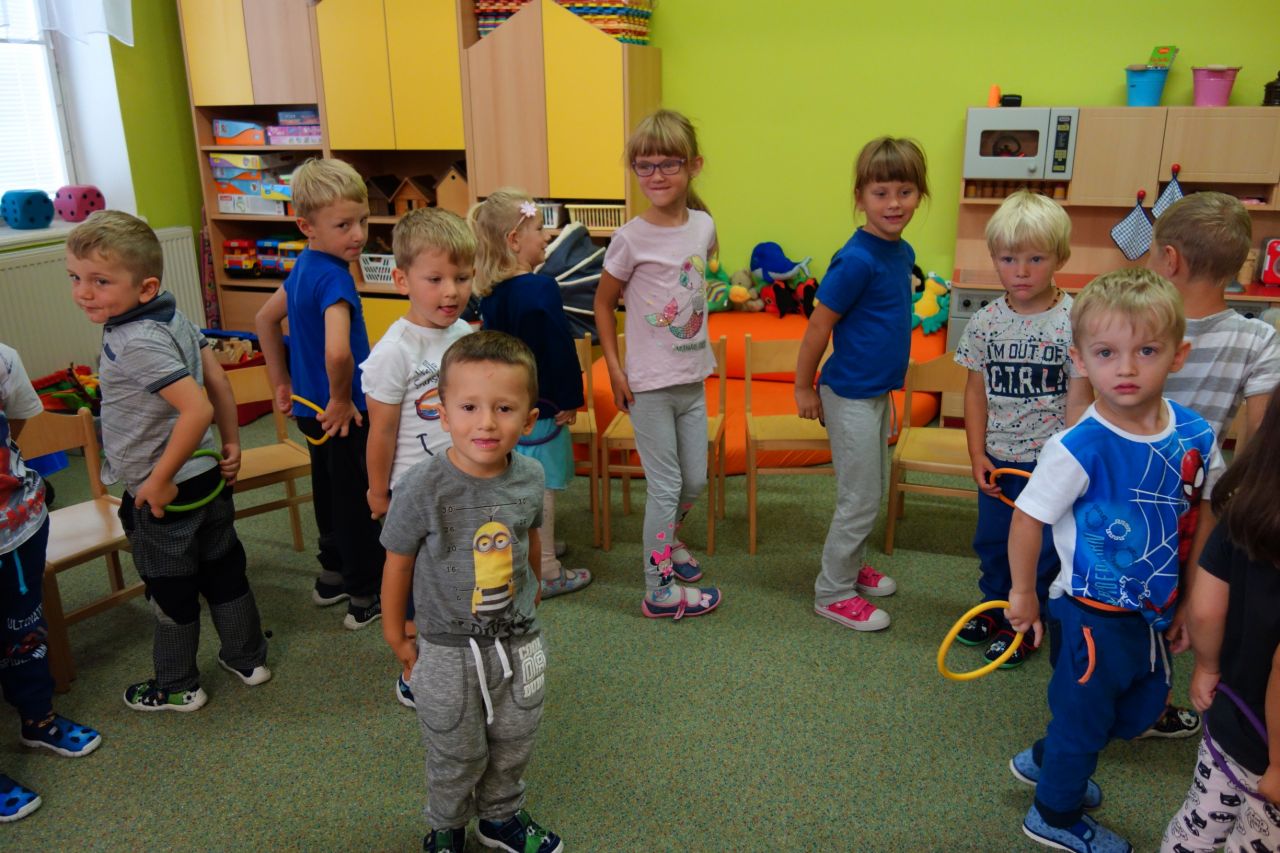 První den jsme přivítali mezi nás hodně nových malých kamarádů, kterých bude v tomto školním roce většina. Mile se s námi přivítal náš velký kamarád prasátko Proužek. Byl stále veselý a zahnal tak některým novým dětem i jejich slzičky. Společně jsme si povídali, zpívali, cvičili s kroužky. Proužek si děti vyzkoušel, zda znají své jméno a značku. Pro radost každému z dětí daroval malé vyrobené prasátko. To aby na něj doma nezapomínaly, neboť Proužek má kouzelné kukátko a v něm vždy všechno vidí a slyší. Slíbil nám, že se na nás přijde zase někdy podívat a že se těší, až si s námi příště třeba zacvičí v tělocvičně.