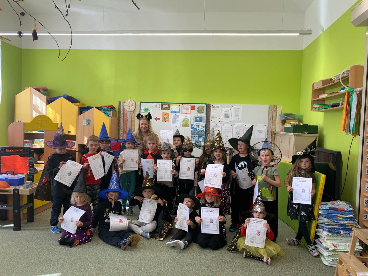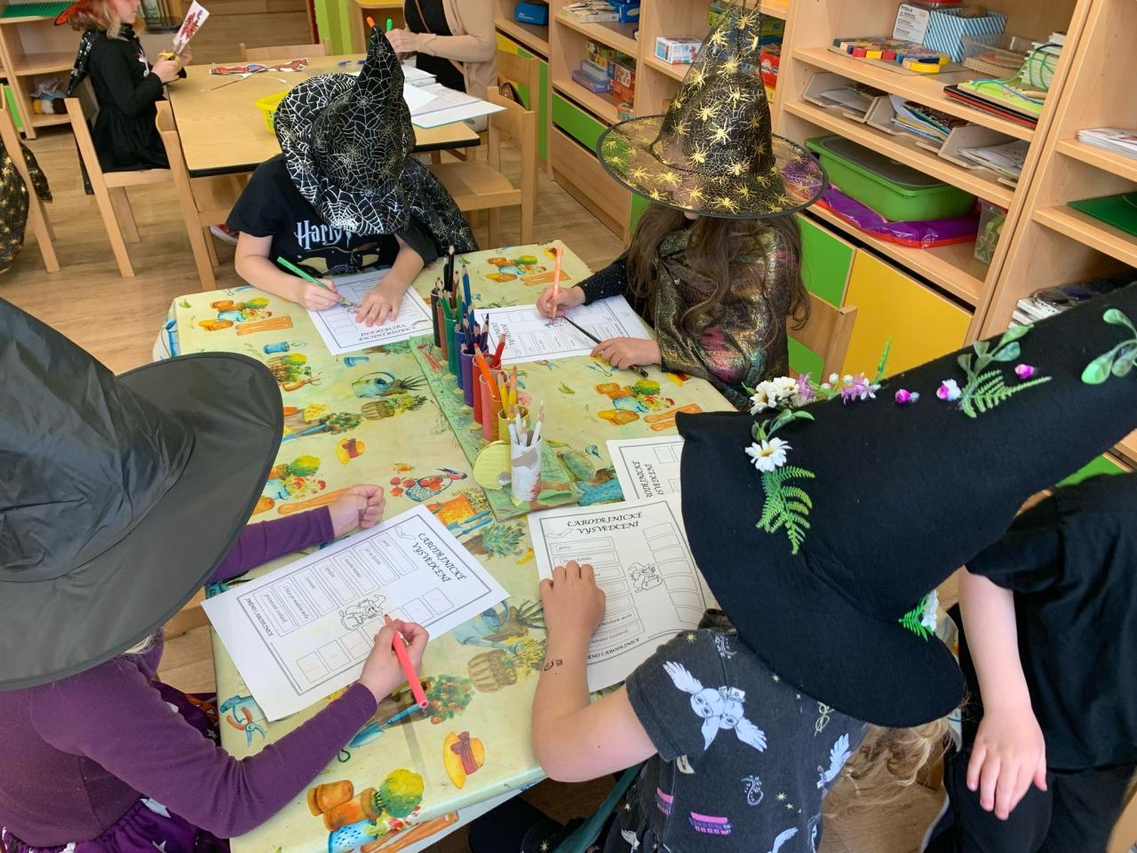 Dnes jsme se sešli v kouzelnické školce. Přišli k nám čarodějové a čarodějnice, někteří s sebou měli i pomocníky: pavouka, myš, kočku....Učit jsme se začali brzy ráno. Vyrobili jsme si kouzelný lektvar, čarodějnickou hůlku a vyplnili čarodějnický list. Po svačince to začalo. Čarodějnický rej v tělocvičně. Nejvíce se nám líbil let na koštěti a plnění kouzel u stolečků. Hlavní čarodějnice a její pomocnice rozdaly všem diplom a něco na zub za splnění čarodějnické školy. Nasedat na košťata a letíme domů.....